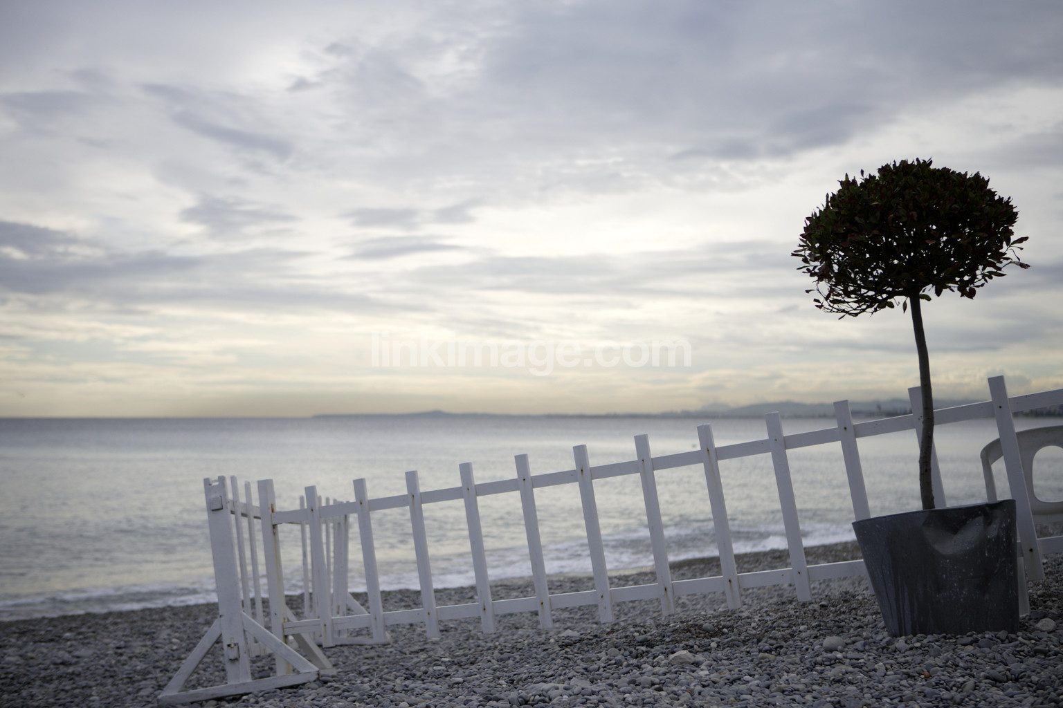 nature, shore, pebble beach, sea, water, sky, cloud, fence, plant, pot, peaceful, quiet, still, sl771
