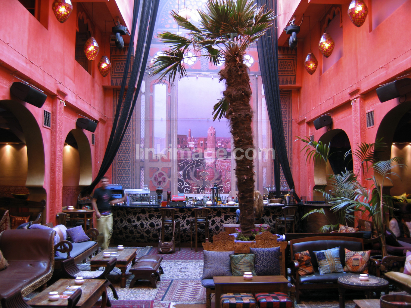 - building, interior, bar, interior, hotel, hotel bar, palm, mood, armchairs, table, chairs, human, guy, bar counter, red, curtains, lighting, local, sl966
