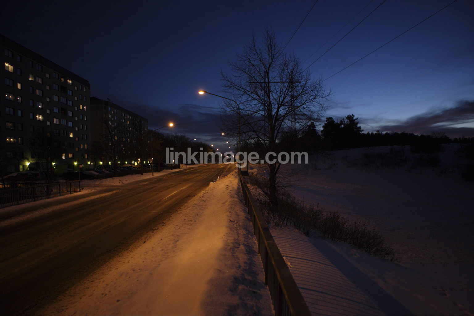 - city, road, evening, night, dark, street lighting, house, building, spot, snow, cold, cool, winter, tree, sky, sl1043