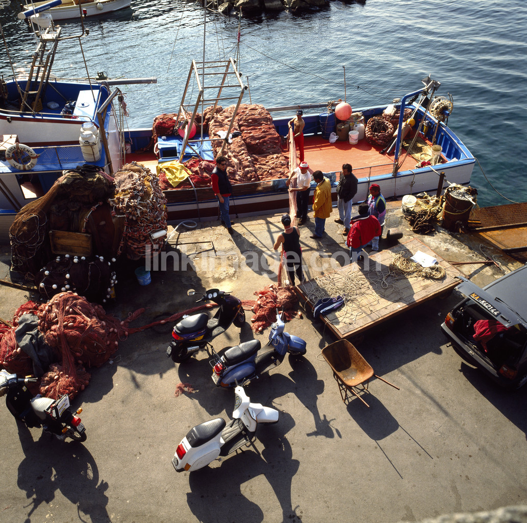 - people, male, worker, fisherman, fishing boat, fishing, network, fishing net, fishing village, water, sea, work, tear, vespas, hot, summer, sun, jams, tangle, survival
