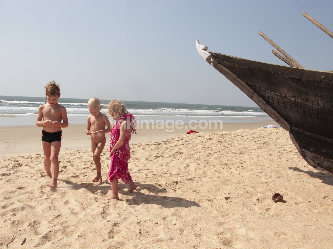 - water, sea, trip, sand, children, siblings, boat, shore, holiday, charter, boy, girls, horizon, sky