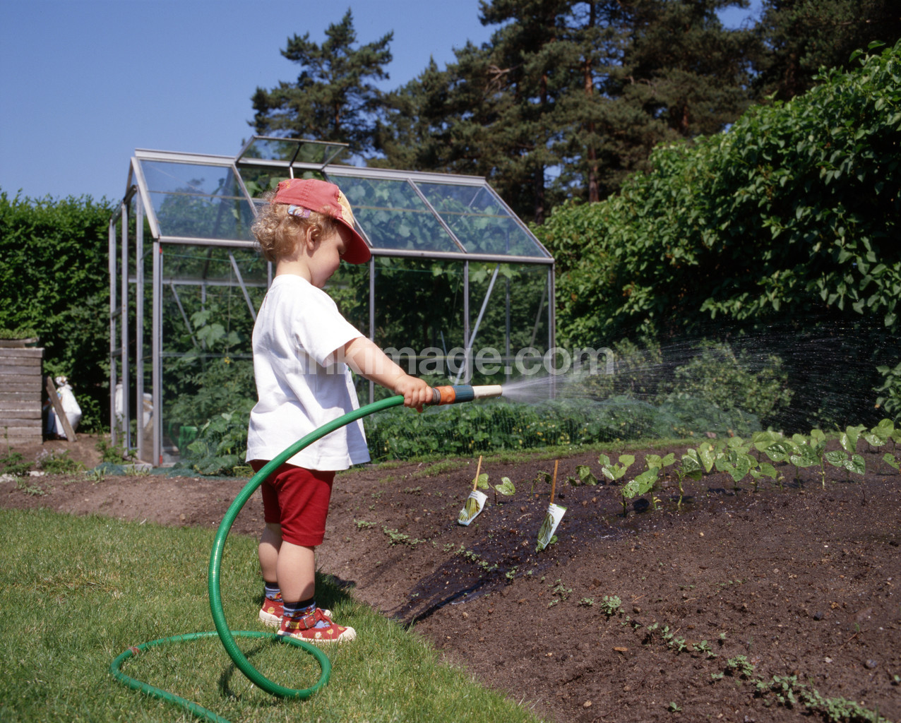 - girl, greenhouse, summer, small, garden, plants, vegetables, country, hose, growing, greenery, water