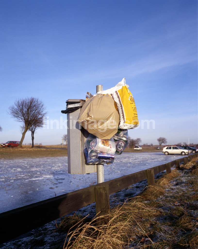 recycling, full, debris, cans, parking, plastic, bag, environment, car, sky, ice, winter, garbage