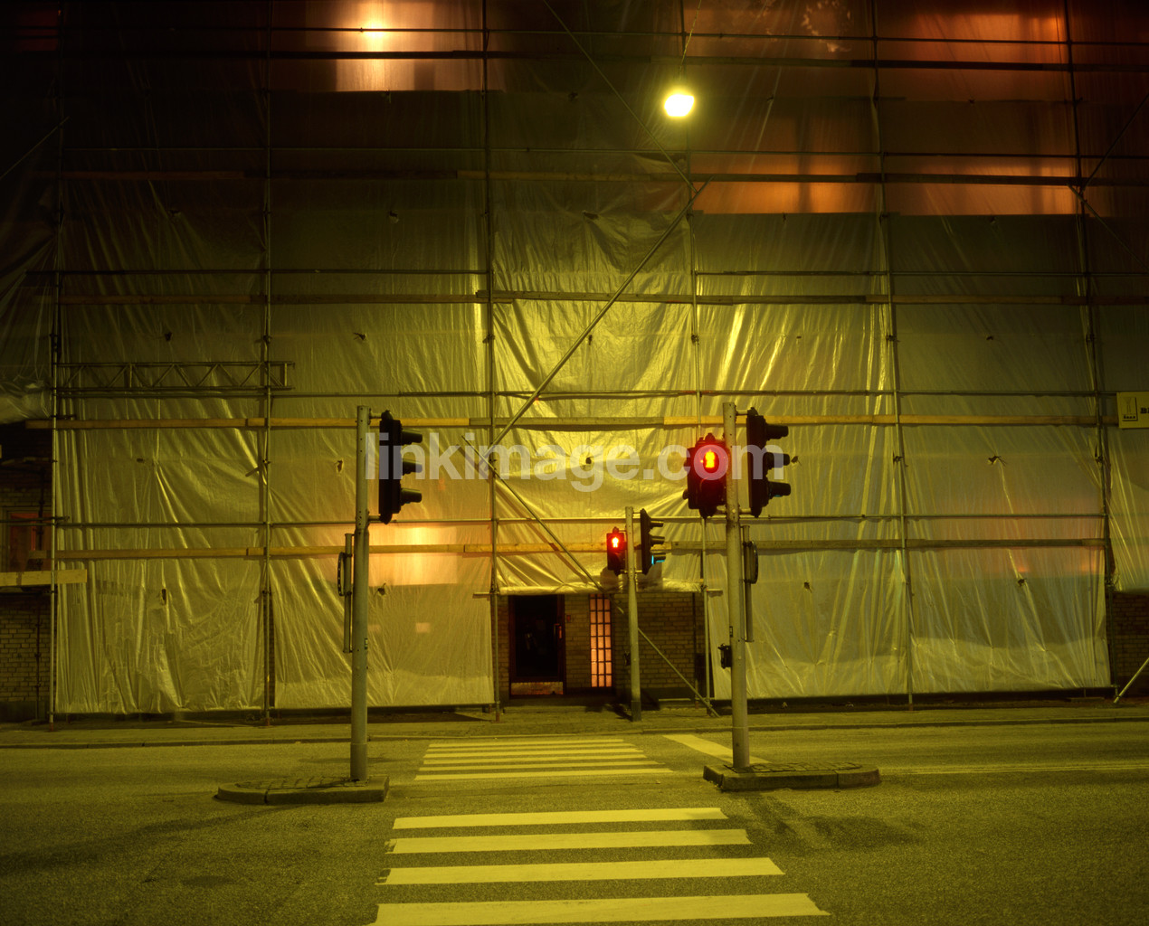 - light, house, lodging, buildings, work, scaffolding, façade, stoplight, pedestrian crossing