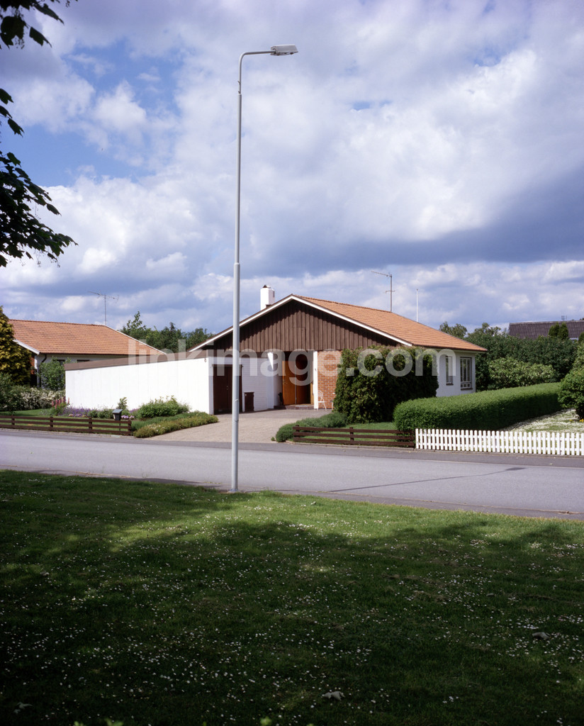 house, villa, lodging, fence, road, street, lawn, lamppost, cloud