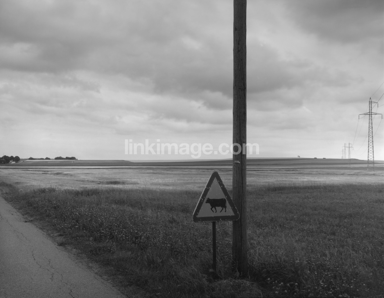 - go, culture, cow, post, traffic sign, warning, sign, power line, line, field