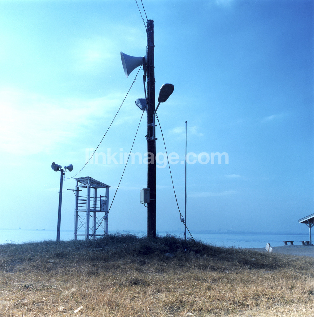 - grass, shore, torn, megaphone, lifeguard tower, horizon, sky, cloud, aw033