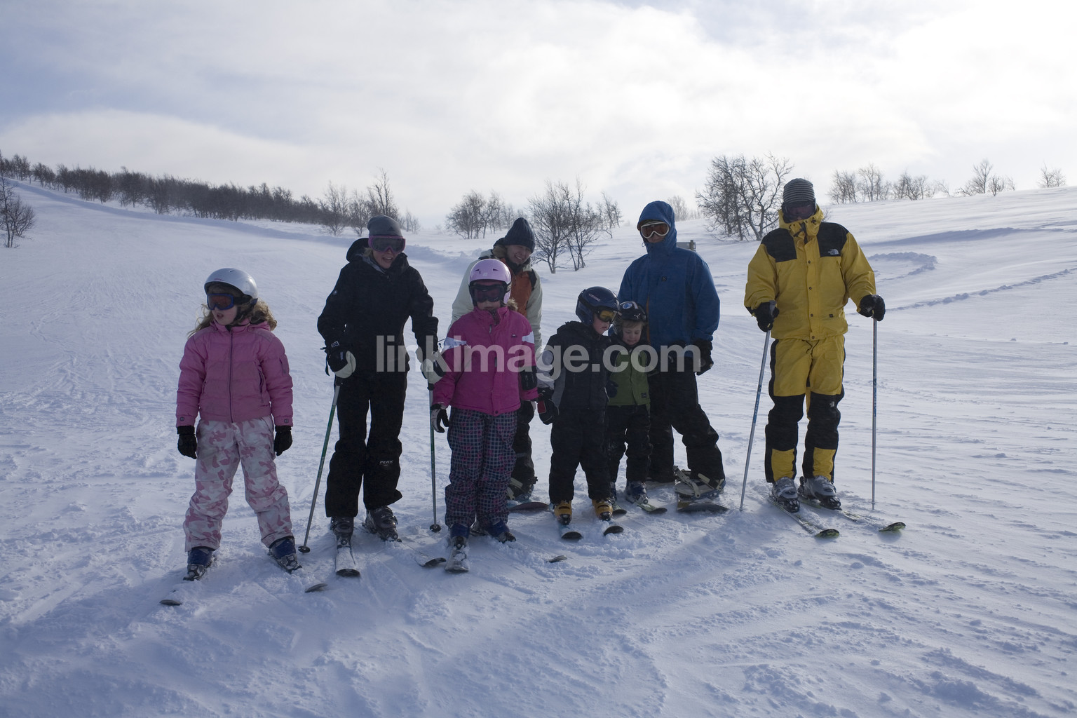 - families, skiing, group photo, hard, wind, sun, slalom, ski, beginners, children, ski slope, helmets, recreational, holiday, leisure, winter, snow