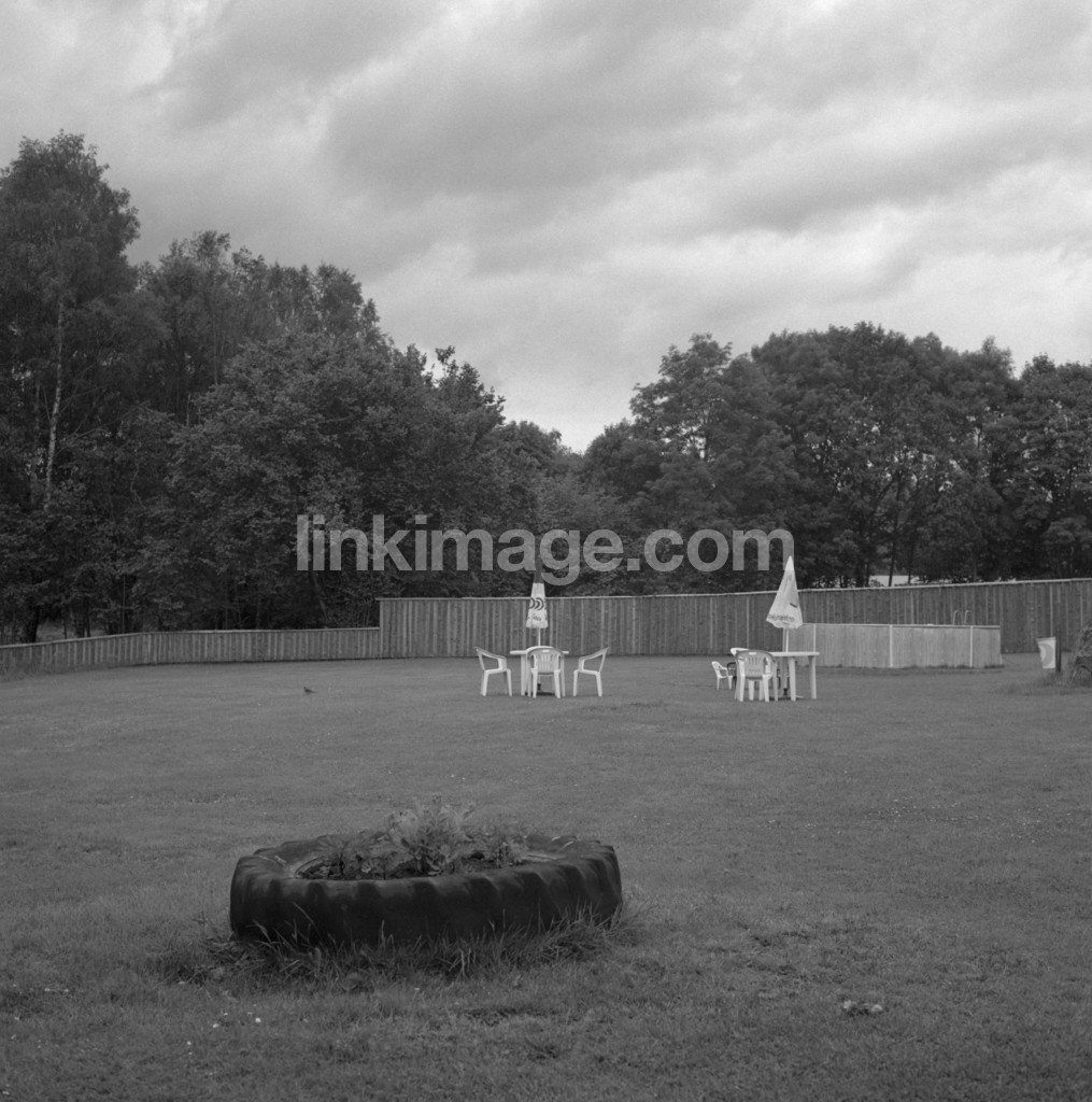 - outdoor dining, plastic furniture, parasol, lawn, forest edges, tractor tires, serving, garden, fence