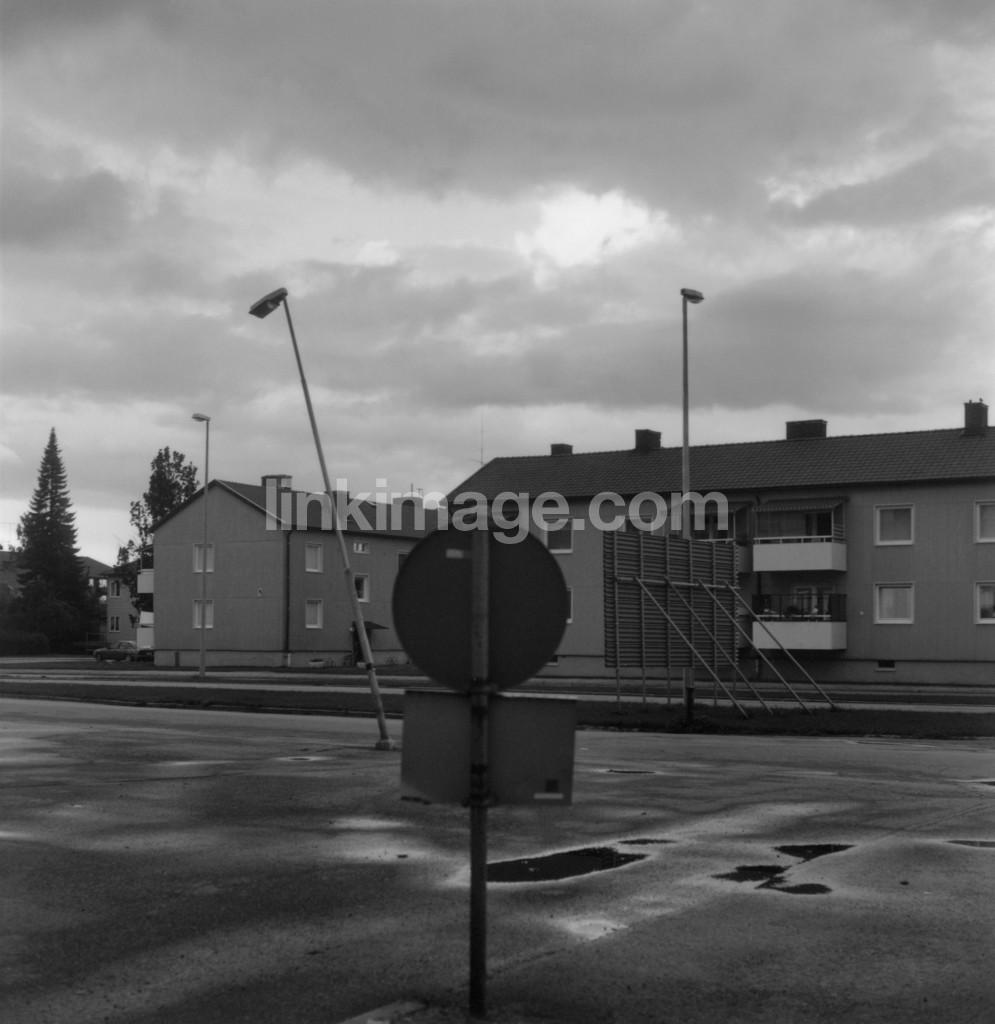 - house, architecture, road sign, post, evening, dusk, puddles, housing