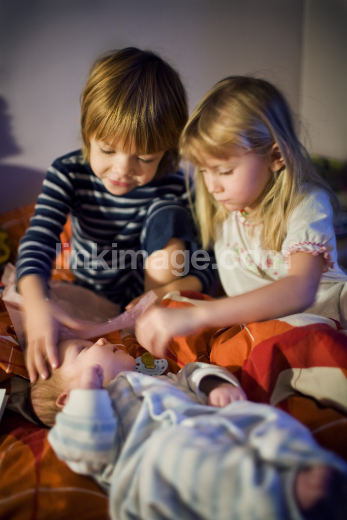 - children, siblings, baby, consideration, curious, watch, tenderness, bed, evening, pajamas, boy, girl, tired