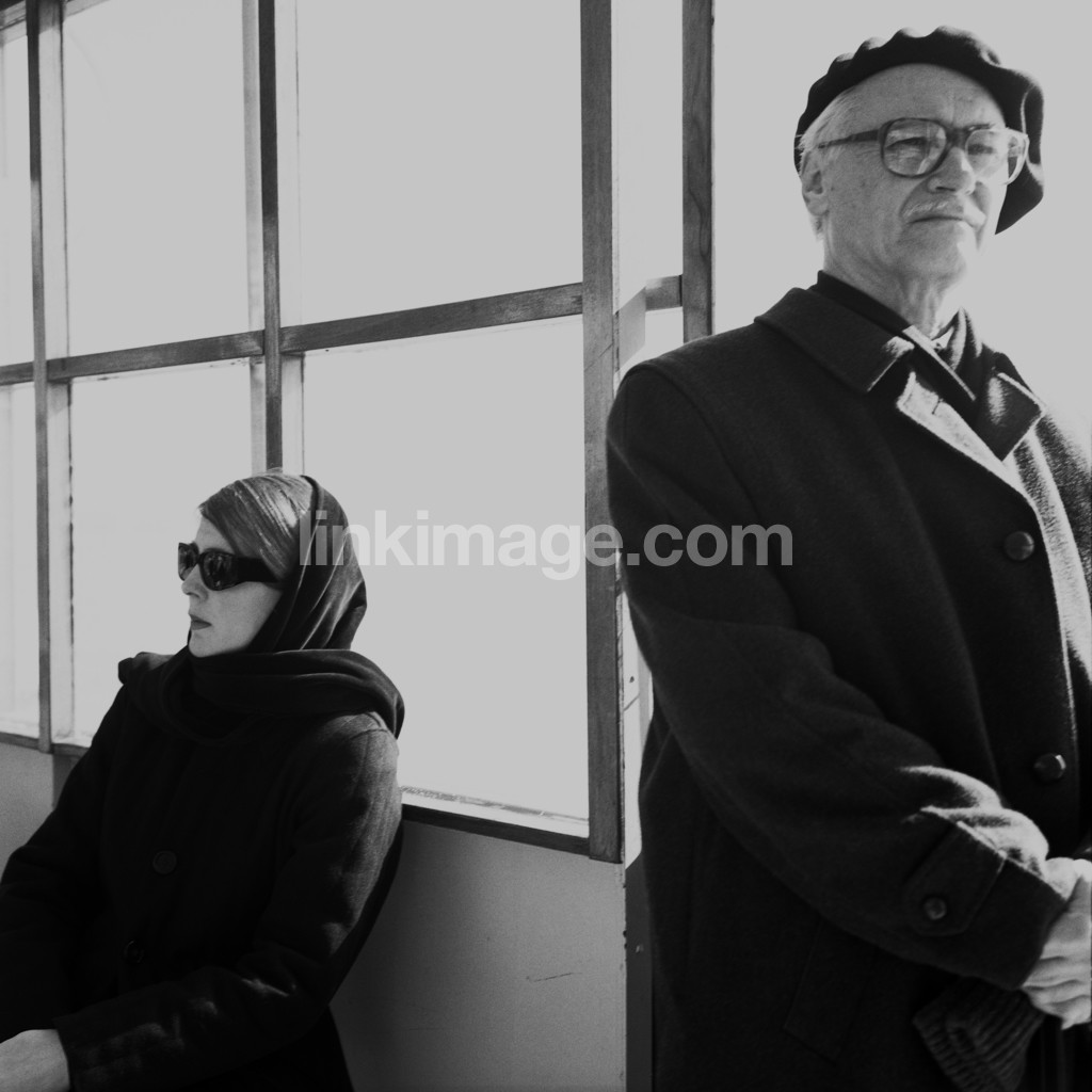 - male, female, sunglasses, eyeglasses, shawl, window, wait, sit, rest