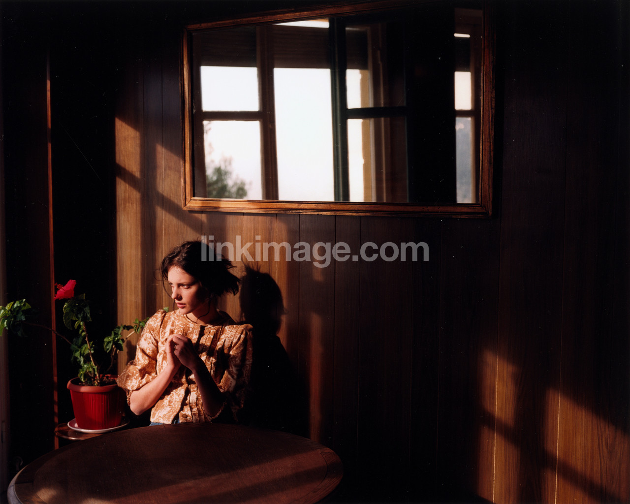 - girl, sitting, inside, sun, window, mirror, table, flower, dress, light, shadow, red, aw093