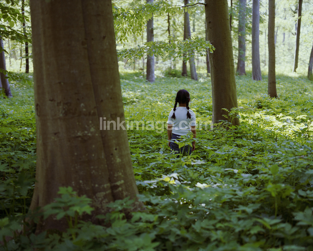 - forest, beech forest, girl, tree, summer, small, alone, spot, greens