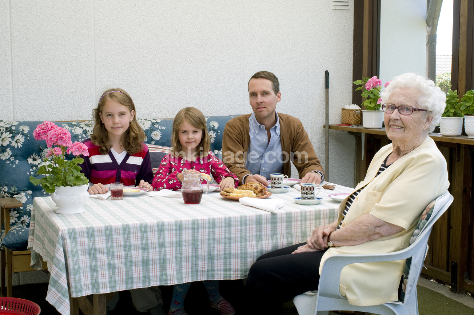 - dad, children, family, adre, grandmother, grandma, girl, lady, male, juice, coffee, cake, together, table, cloth, sofa, father