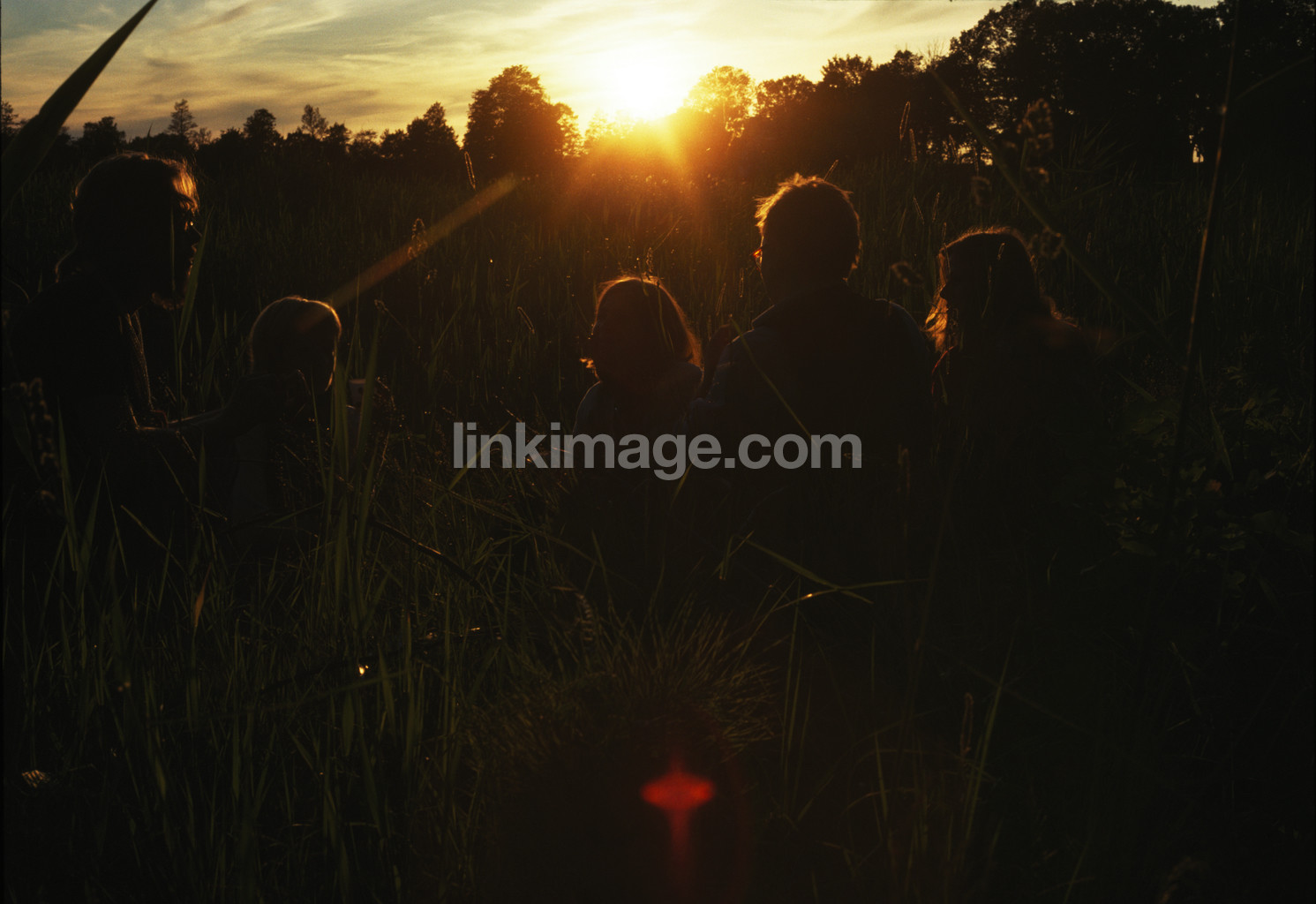 - human, male, female, group, nature, grass, spot, sun, sunset, dusk, backlight, rest, picnic, rasta, unscheduled, holiday, conversational, talk, summer, evening