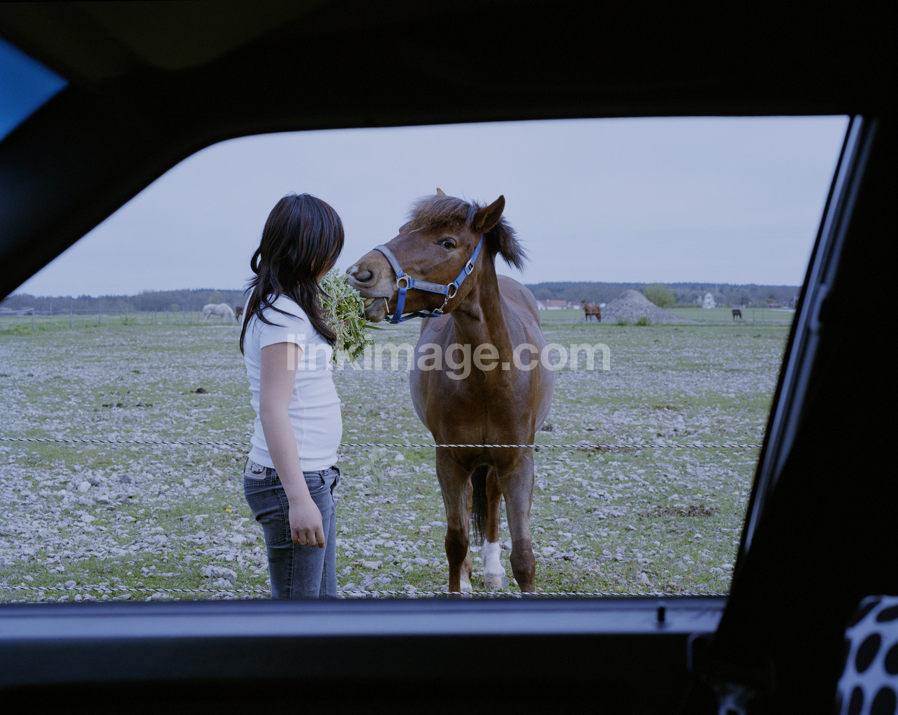 - children, girl, horse, animals, car window, pasture, feed, spot
