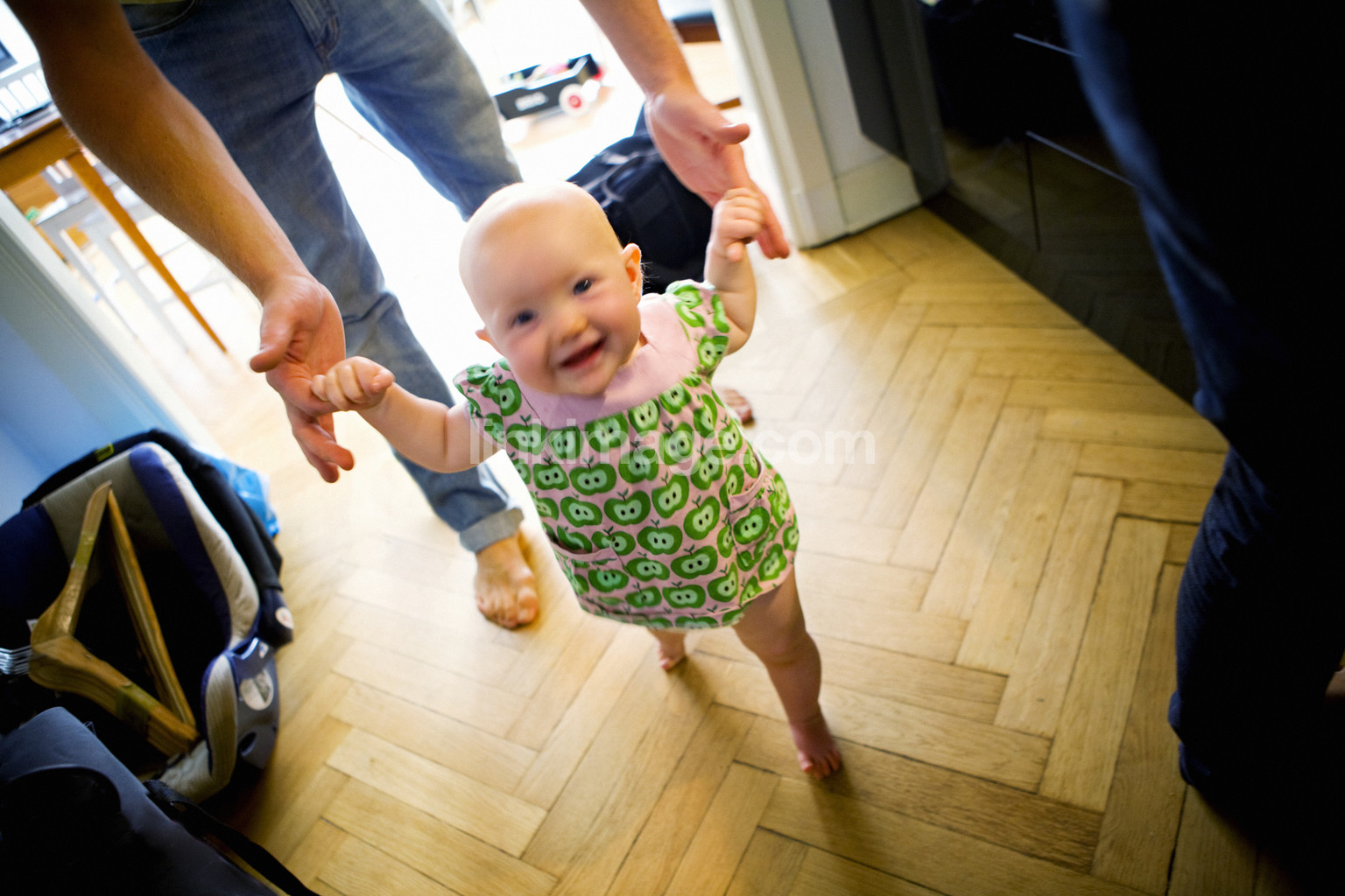 children, girl, infant, go, apartment, parquet, floor, motor, hold, hands, forward, bone, mother, family