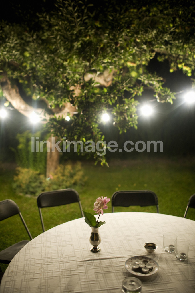 party, feast, night, evening, flower, table, wedding, garden, tree, chairs, lighting