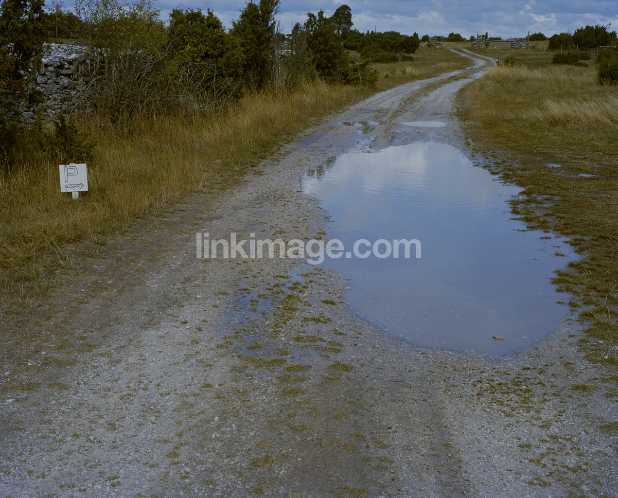 - road, gravel road, puddle, parking, sign, parking plate, arrow, direction, fall