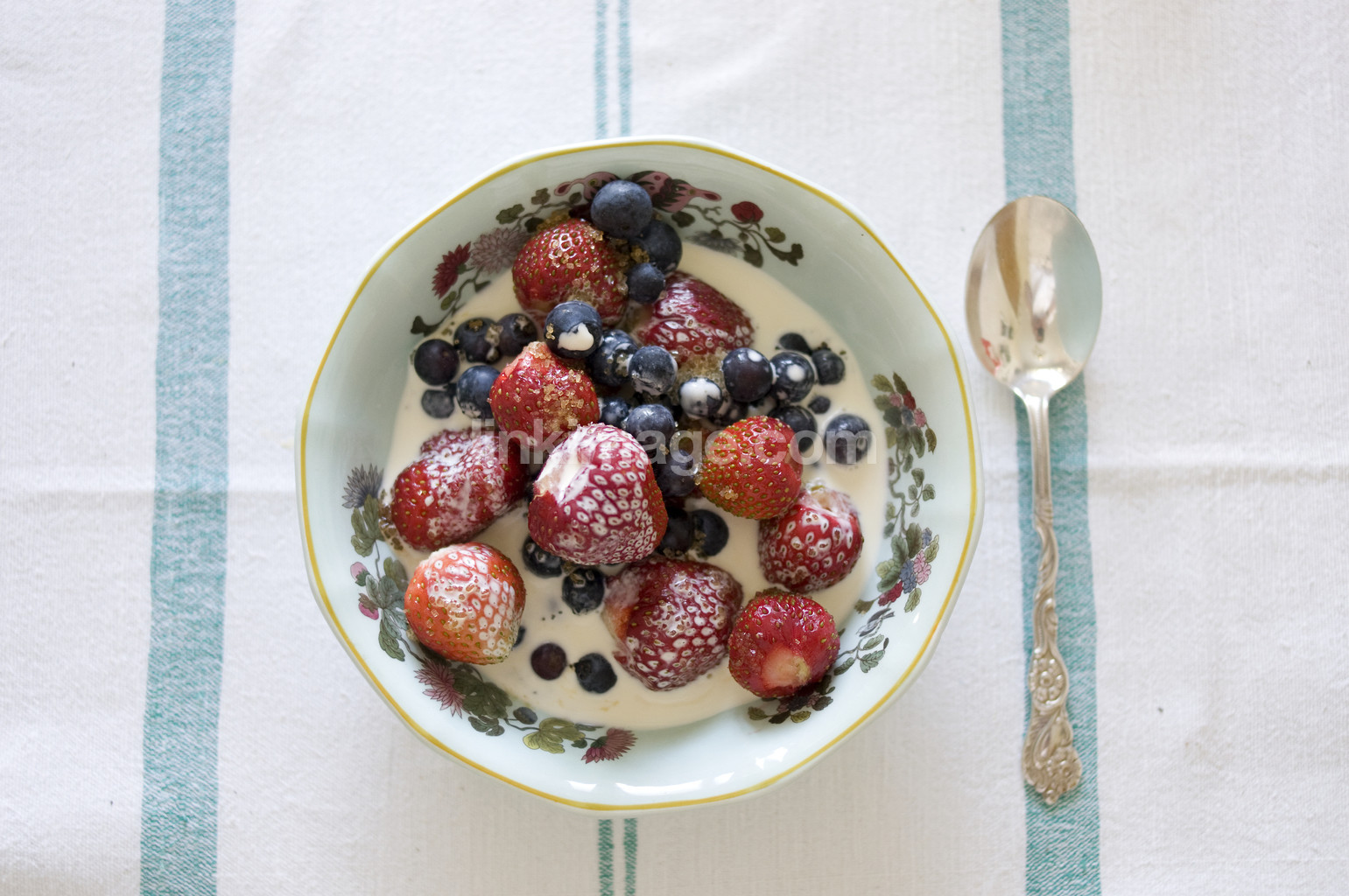 - berry, strawberries, cream, spoon, table, food, health, blueberries, fruits, dessert