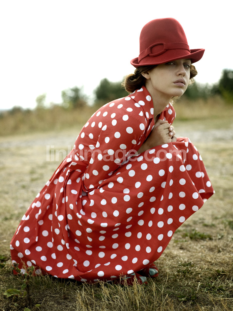 - female, sitting, squatting, hat, together, krupen, girl, portrait, forest, tree, grass, red, dress