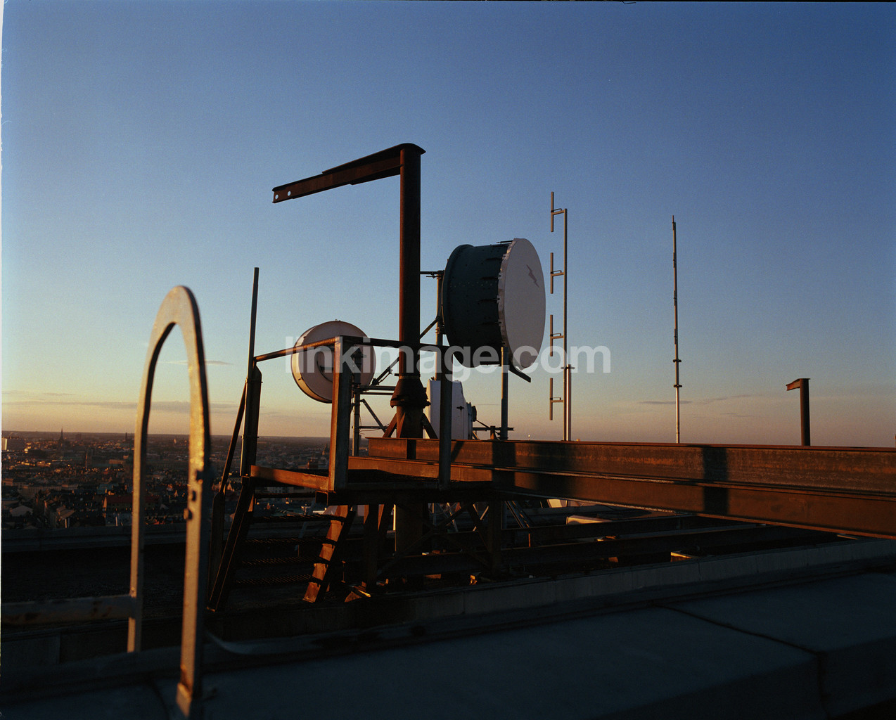 radio, transmitter, tv, antenna, iron, rail, ceiling, views, mast, city, rooftops, building, sunset, sky, dusk, evening