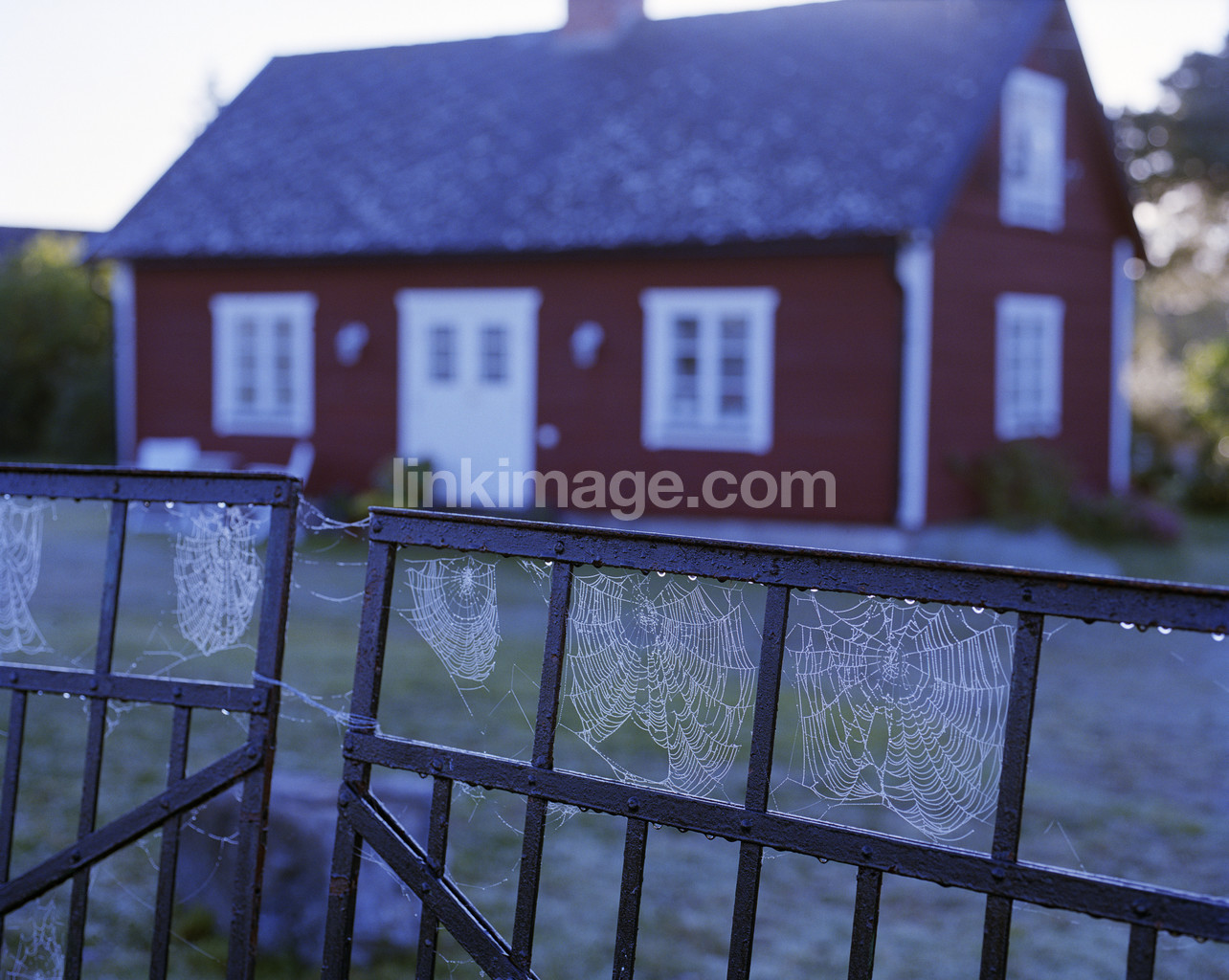 - cobweb, dew, dawn, drops, water drops, house, red, gate, summerhouse, fall, network, spindle, door, port
