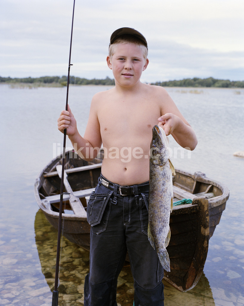- boy, guy, fishing, catch, pike, fish, happiness, hobby, rowboat, summer, portrait, boat, lake, water, sea
