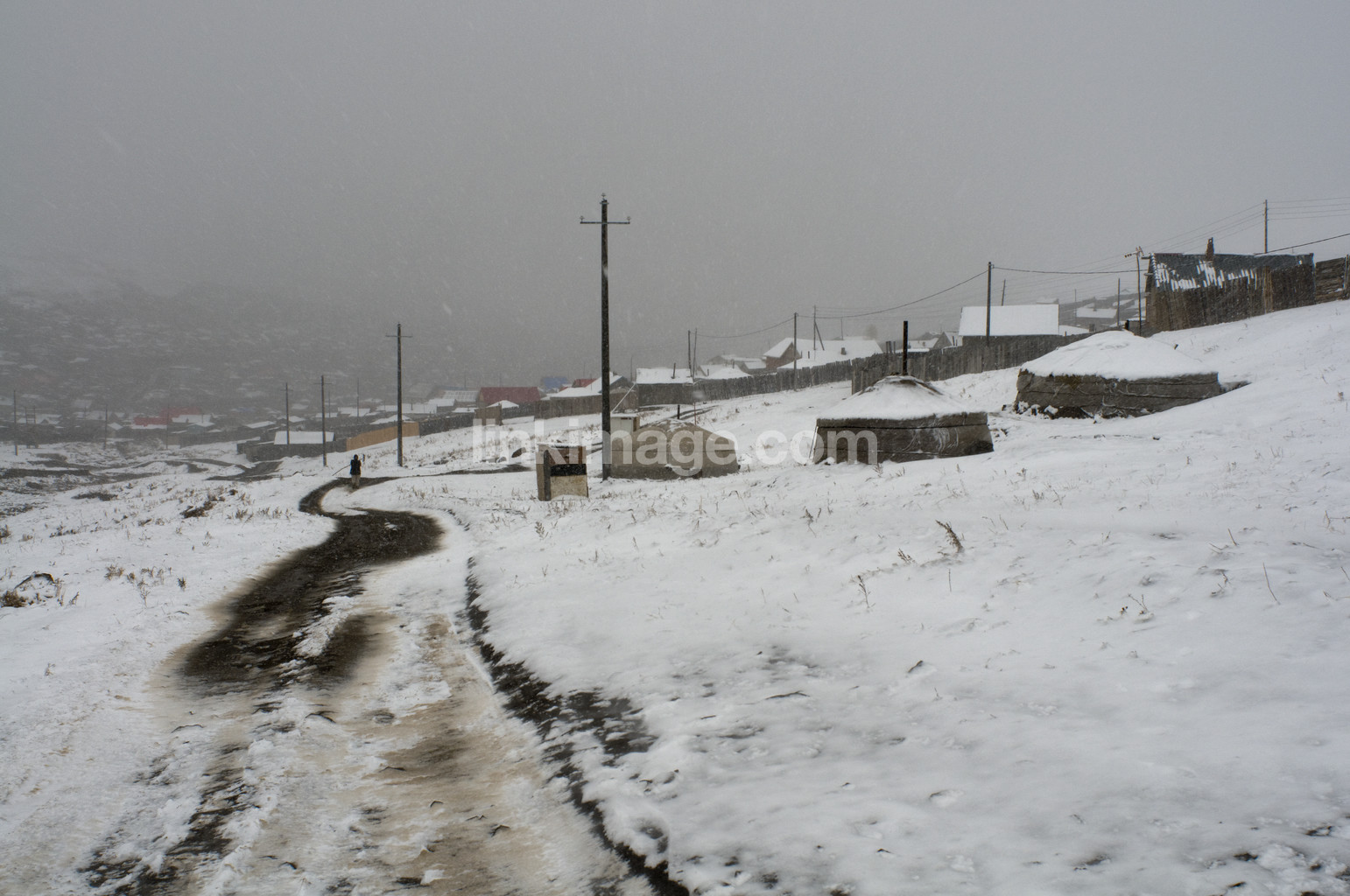 - buildings, domestic environment, tent, yurt, road, snow, winter, suburb