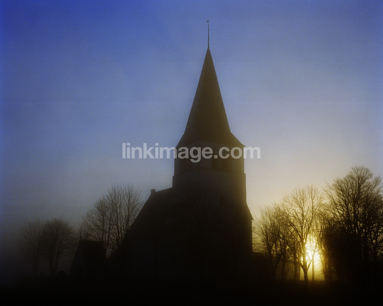 - church, religion, dawn, morning, sun, sunrise, tree, mood, light, soft, fog, haze