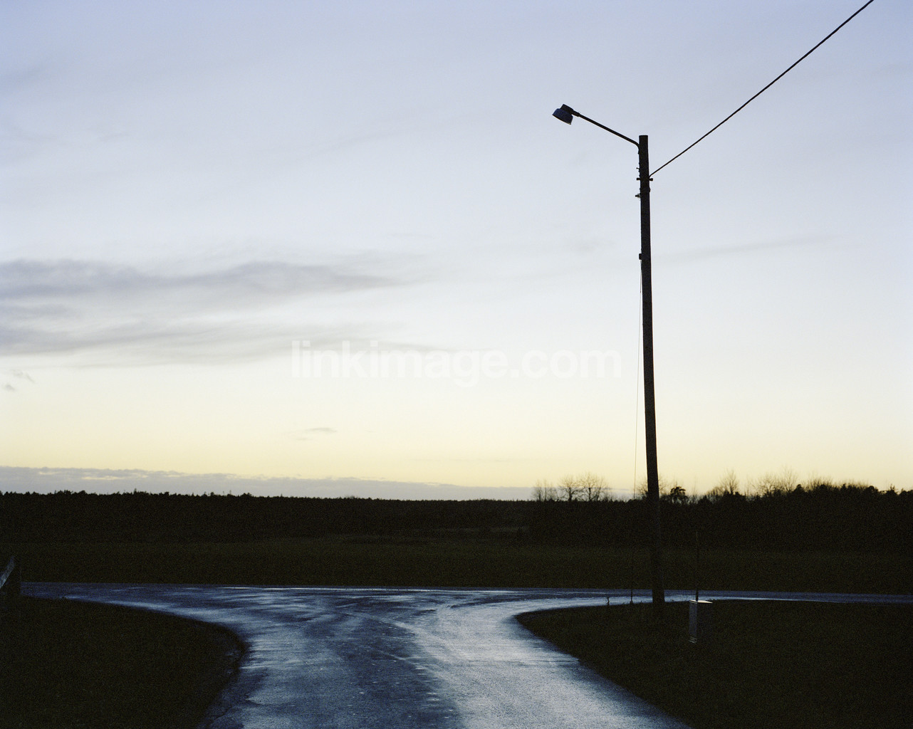 - road, crossroads, evening, dusk, telecommunications post, telephone pole, power pole
