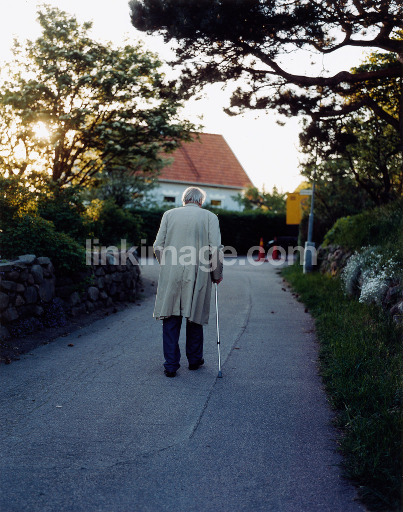male, go, street, pavement, kappa, older, cane, asphalt, tree, bushes, plants, sunlight, bk382