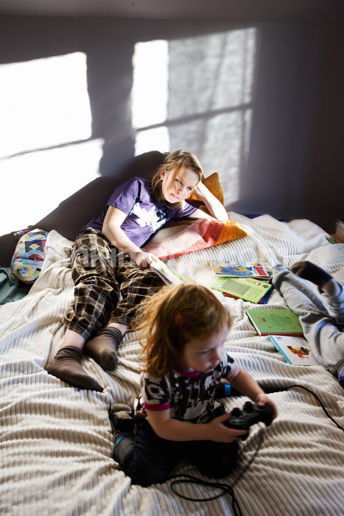winter, sun, bedroom, children, read, play, videogame, bed, rest, unscheduled, pleasure, games, girl, siblings