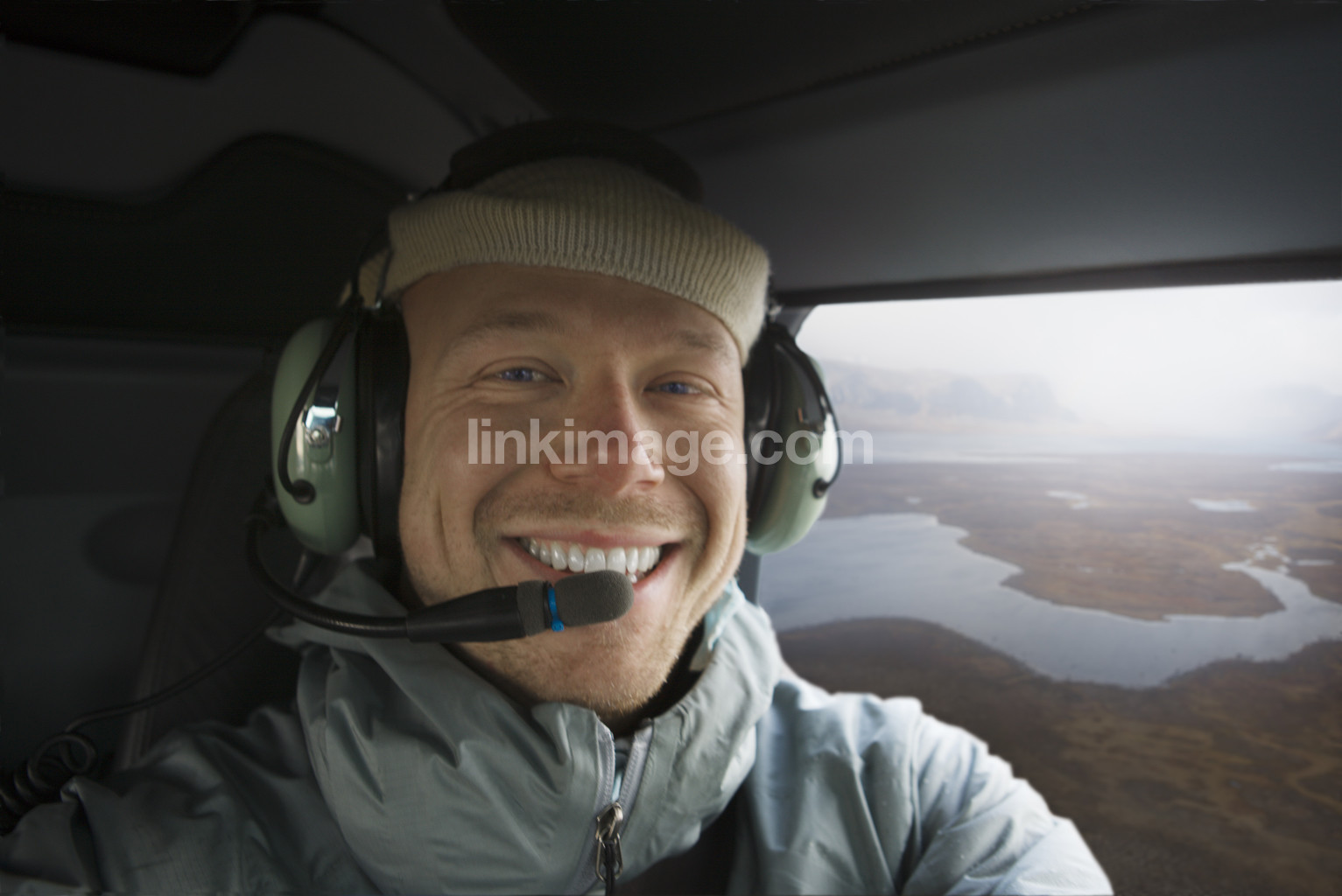 - male, guy, fly, trip, holiday, environment, rock, view, views, helicopter, pleasure, portrait, happy, microphone, river