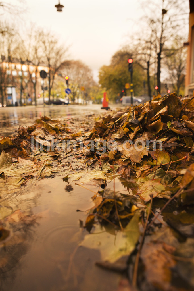 city, leaf, weather, rain, wet, street, road, traffic lights, stoplight, fall, puddle, water