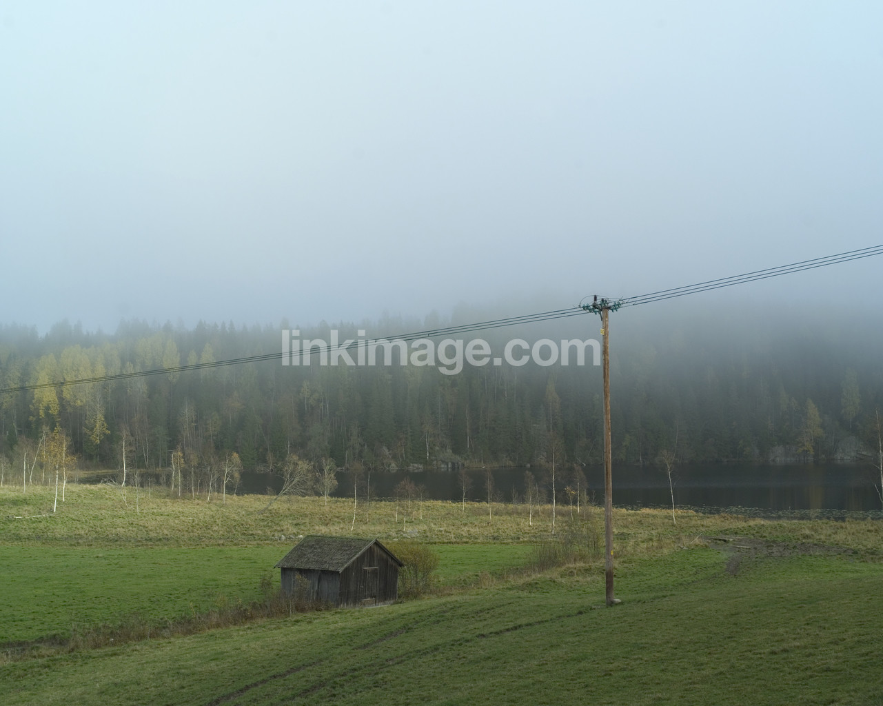 - barn, telephone pole, telephone wire, morning haze, morning, fall