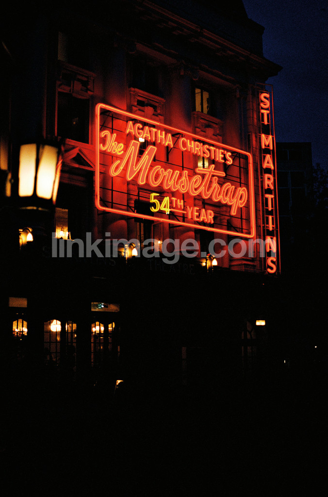 - night, evening, light, neon, neon lights, sign, advertising, house, theater, culture, red, mouse trap, title