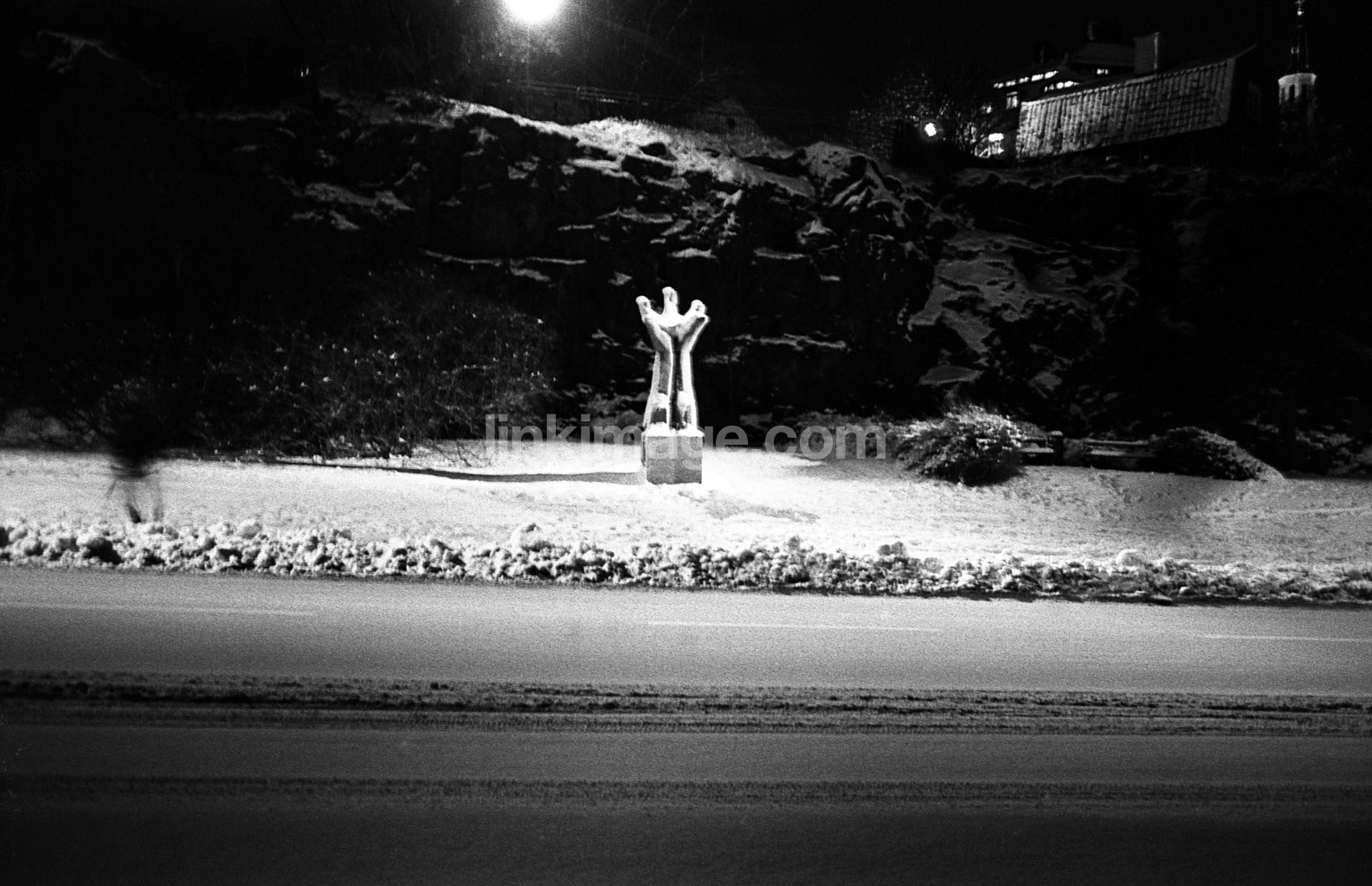 rock, cut, winter, snow, statue, monuments, sculpture, art, memory, hand, street, road, night, evening, södermalm, lock