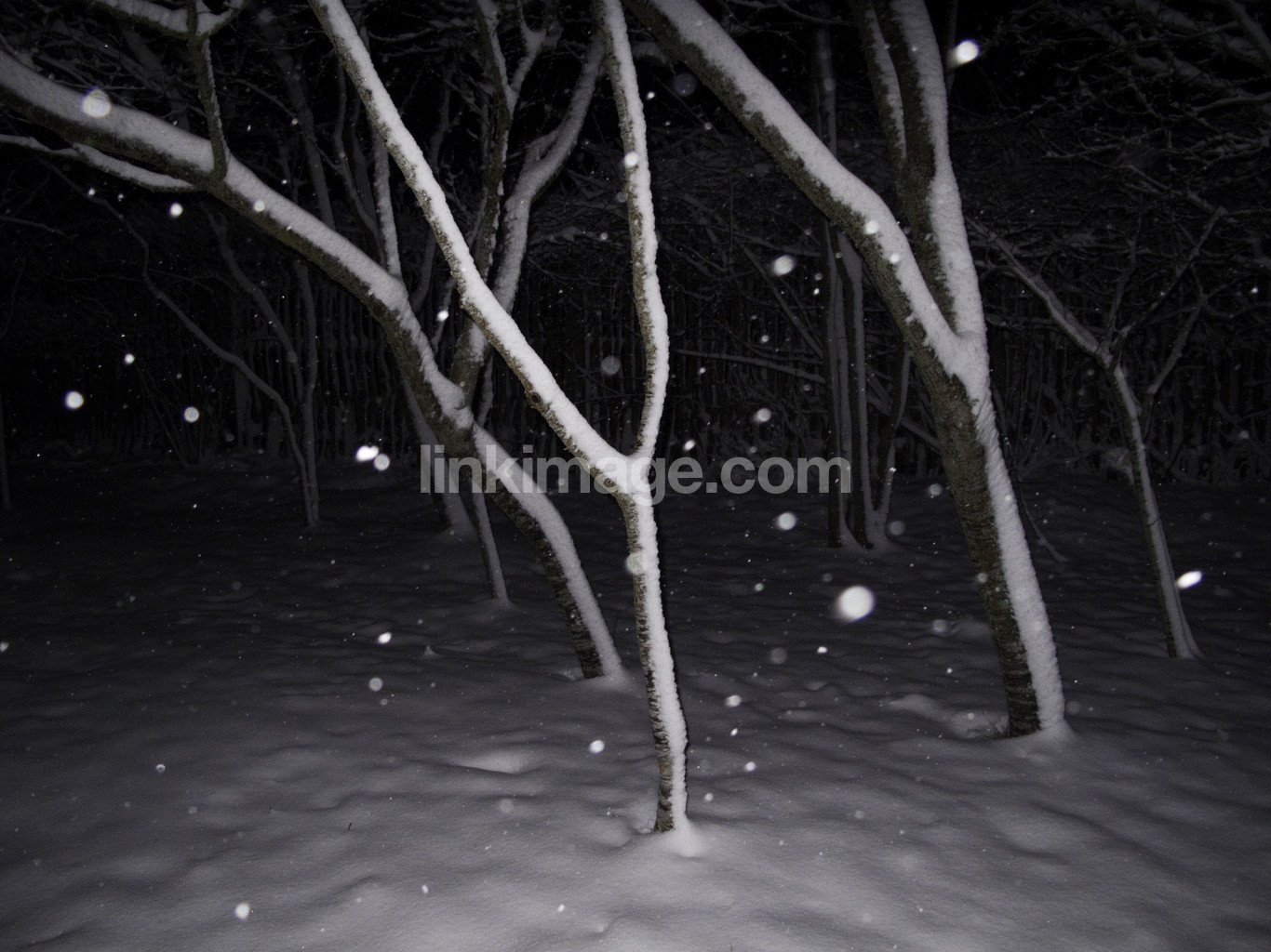 - snow, snowing, tree, night, dark, garden, winter, cold, tree trunks, mysterious