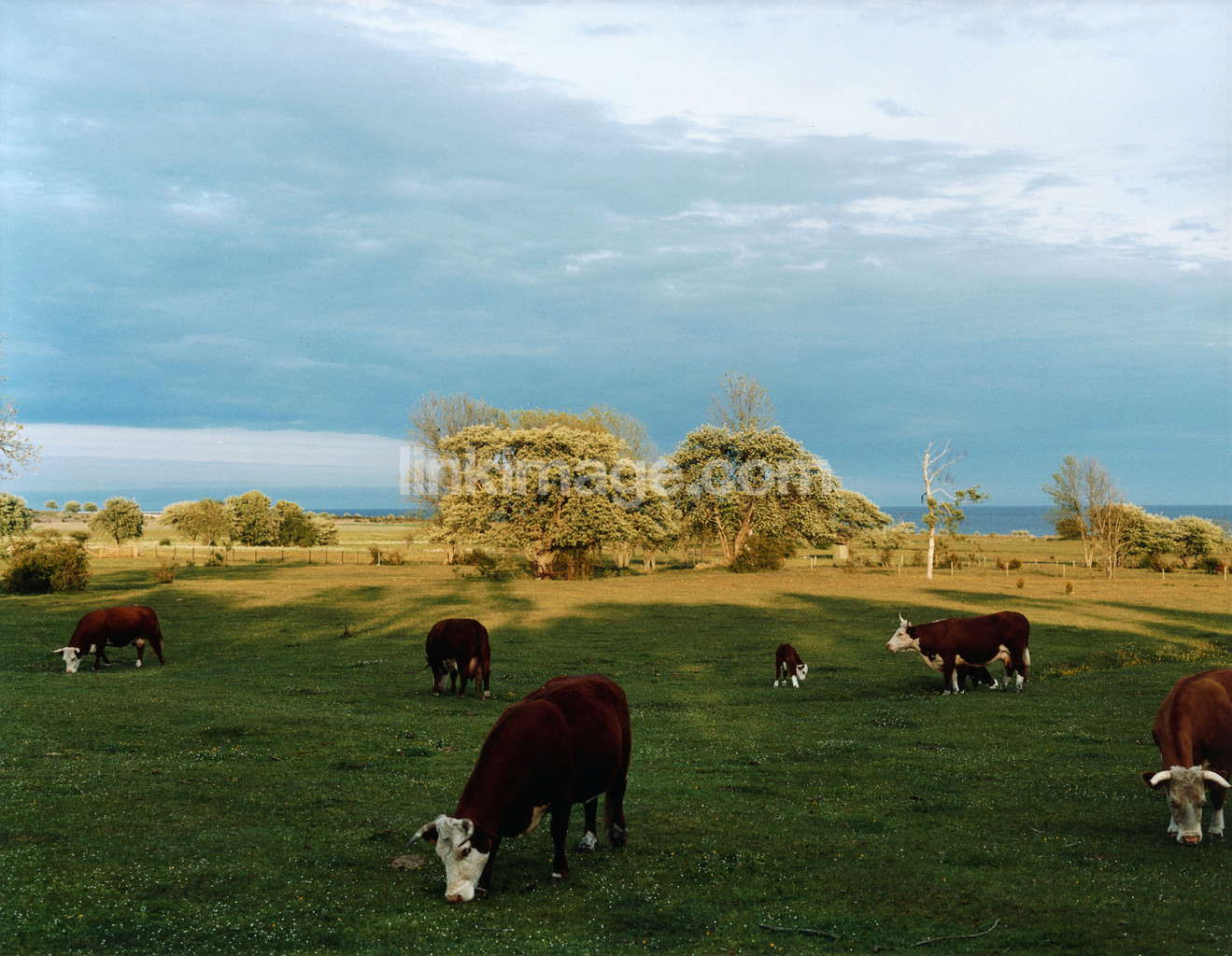 cow, cows, calves, tree, blue, sky, meadow, horizon, plants, water, spot, bk446
