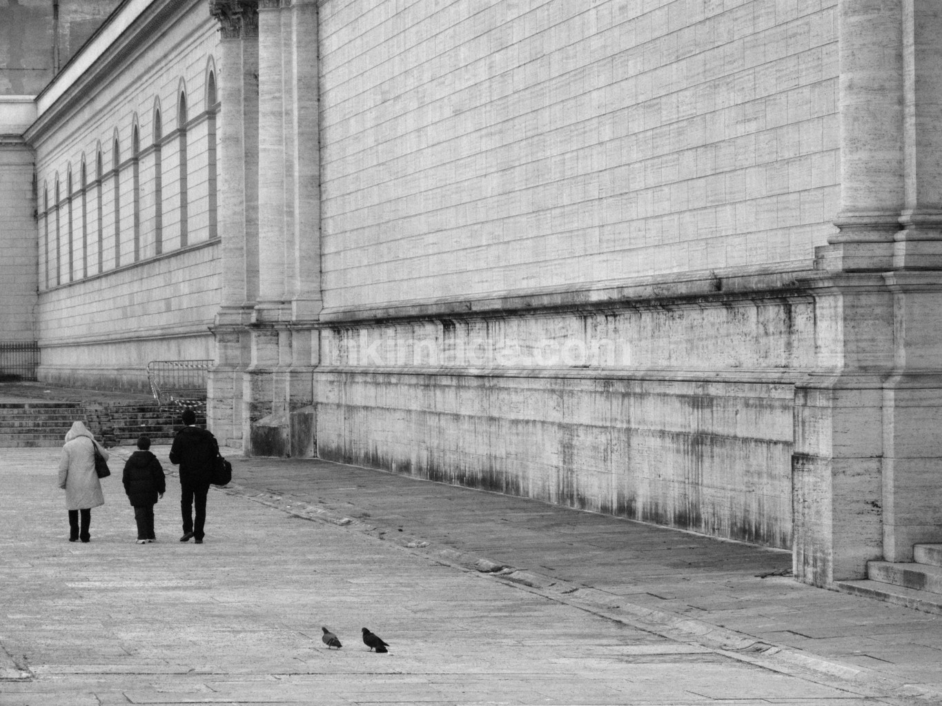 - church, monastery, concrete, marble, single, pigeon, two, pigeons, three, back, walk, go, building, people