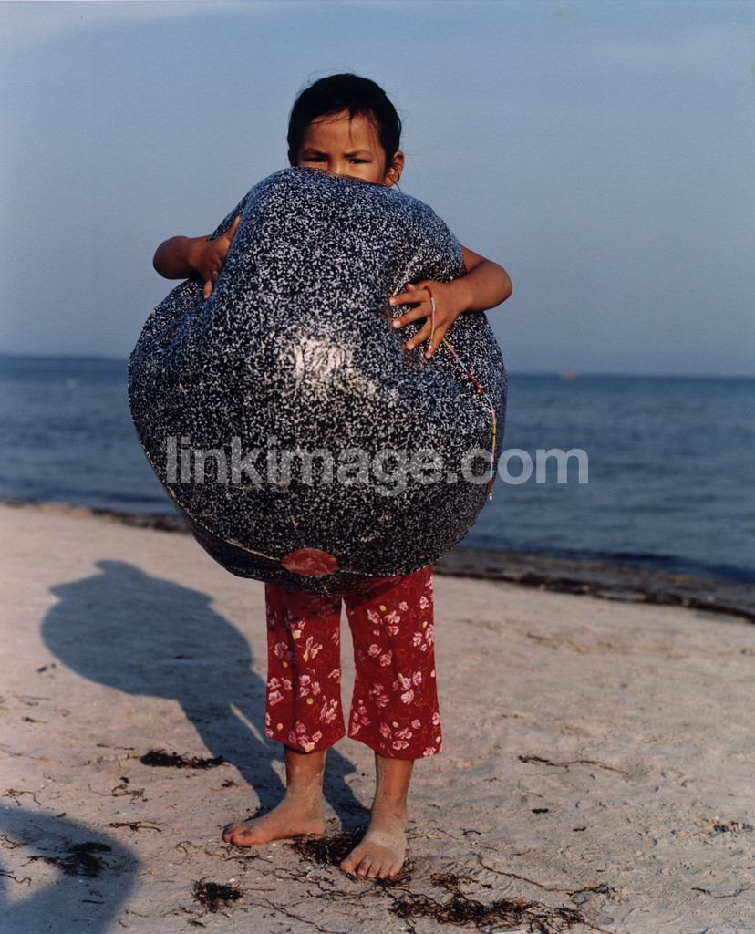 summer, shore, girl, children, ball, plays, sand, coast, water, sea, lake, horizon, sky, bk482