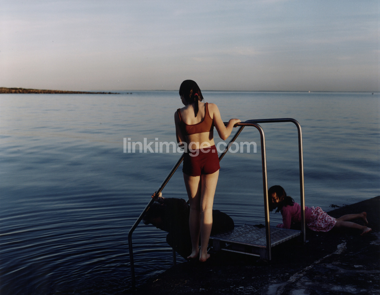 summer, swimming, ladder, children, sea, lake, water, bikin, play, bath, swim, horizon, sky, bk484