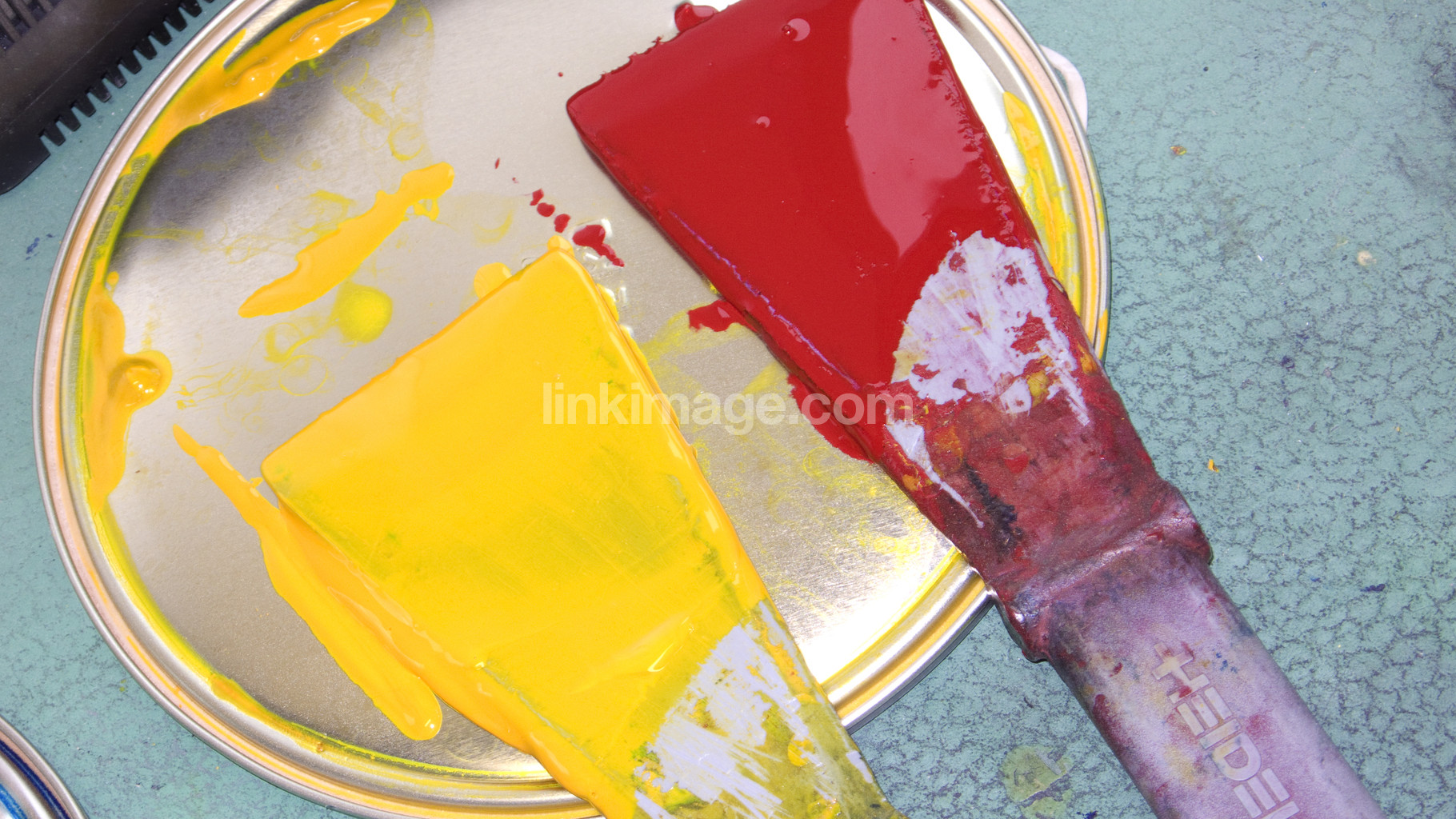 colors, cap, yellow, red, spatulas, still life, paint, painter