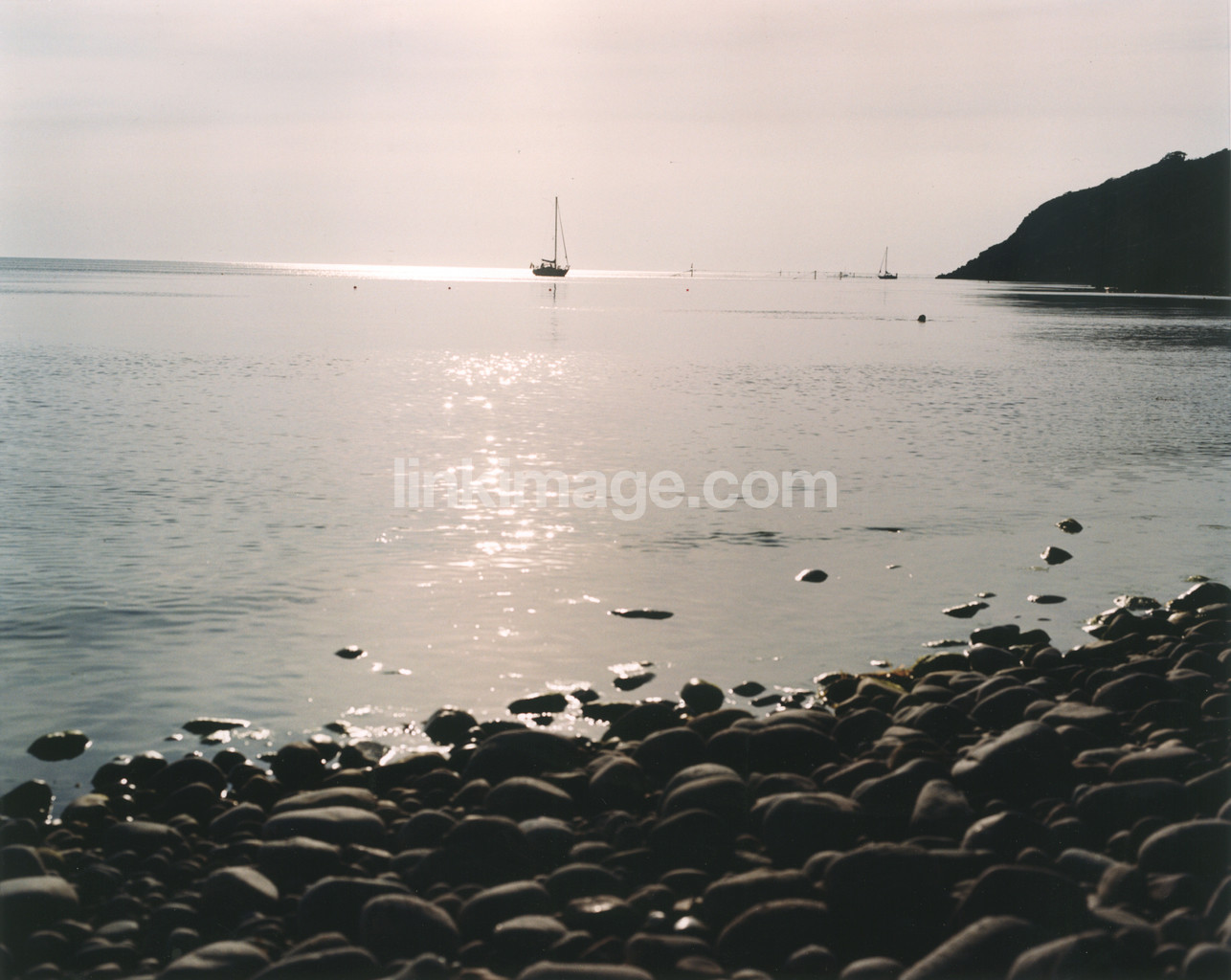 boat, water, bay, shore, stones, stone, pebbled, sailboat, horizon, sky, reflection, light, bk529