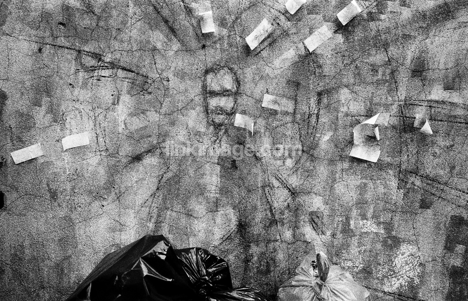 - graphic, garbage, trash bag, debris, wall, façade, backyard, paper, scrap of paper
