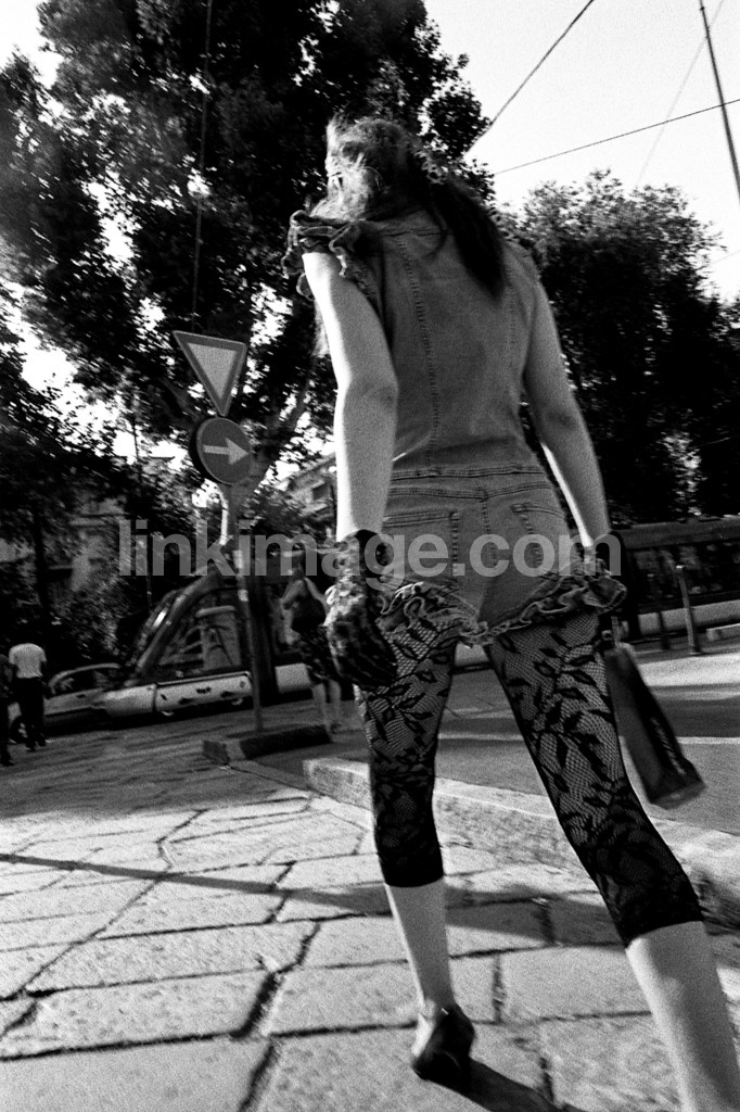 - female, girl, summer, back, street, pavement, leggings, traffic sign