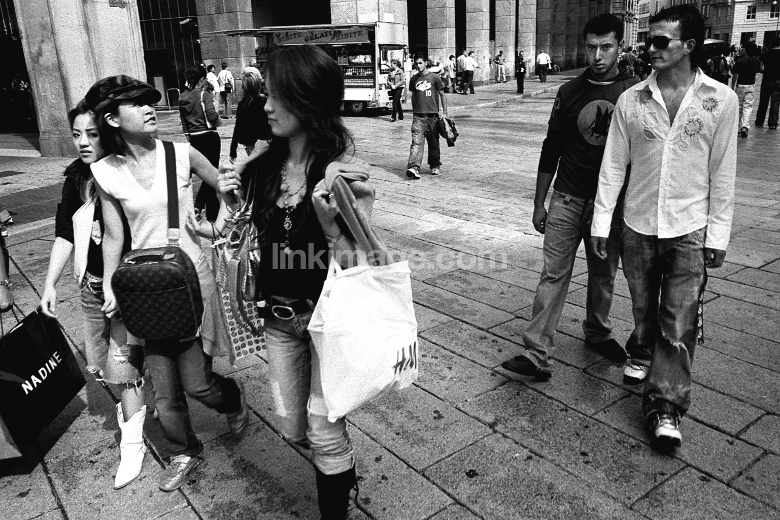 - female, girl, male, guy, tourism, tourism, trade, shopping, square, holiday, pavement, group