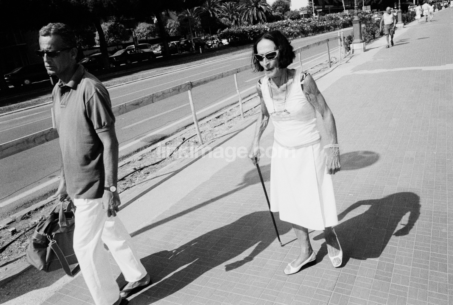 - female, lady, male, lord, summer, shadow, light, cane, street, pavement